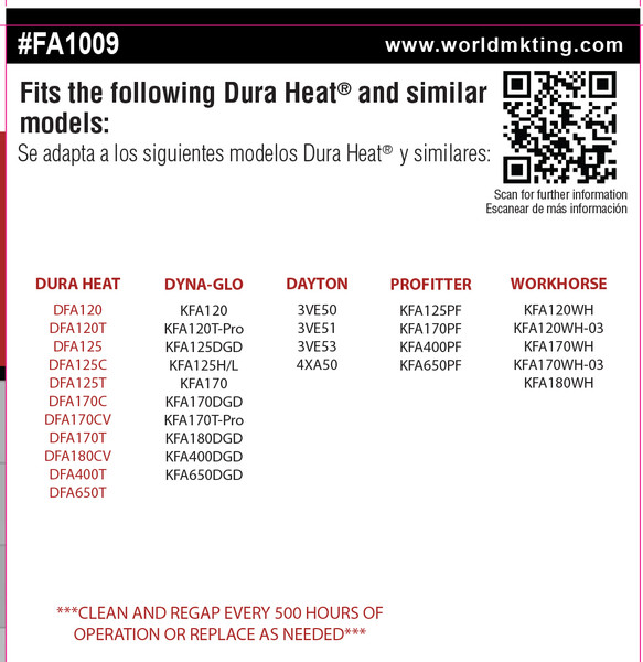 Spark Plug for select kerosene forced air models. Fits the Following Models: DURA HEAT: DFA80T, DFA135C, DFA210C, DFA210CV, DFA220CV REDDY HEATER: RFA80T, RFA135C, RFA220CV